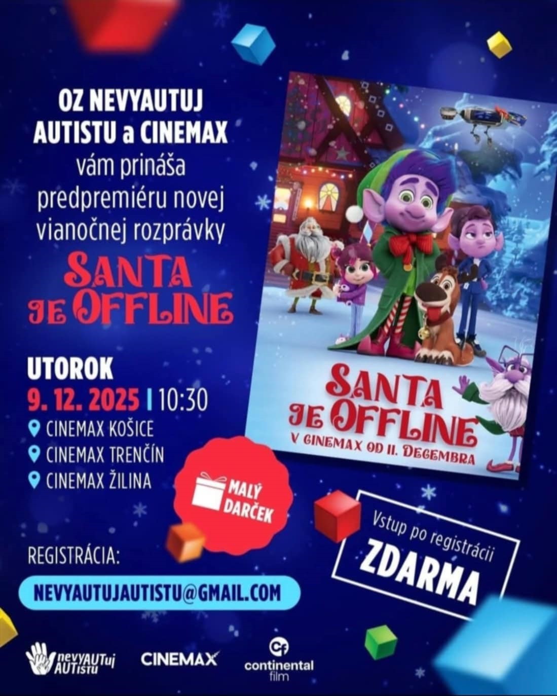 Cinemax Žilina 9.12.2025 rozprávka,, Santa je OFF LINE,, zabezpečila pre deti s autizmom organizácia nevyAUTuj AUTistu. Veľká vďaka.